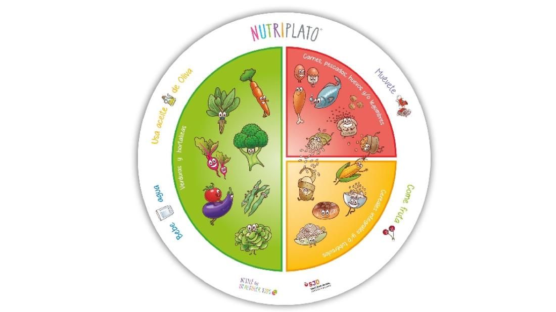 Se trata de un plato de tamaño real que, con colores y divertidas imágenes, marca las proporciones adecuadas de los grupos de alimentos que deberían estar presentes en las dos comidas principales del día: la comida y la cena.