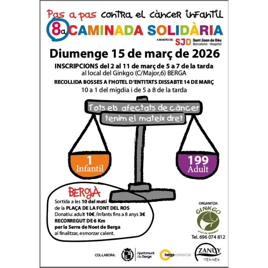 15 Marzo 2026¡Llega la 8ª caminata solidaria 'Pas a pas' de Ginkgo Apac Berguedà! Seis quilómetros de solidaridad por la sierra de Noet para fomentar la investigación del cáncer infantil en Sant Joan de Déu. Se trata de un evento apto para todo el mundo, que es posible gracias a la colaboración de Bergacomercial y el Ajuntament de Berga.