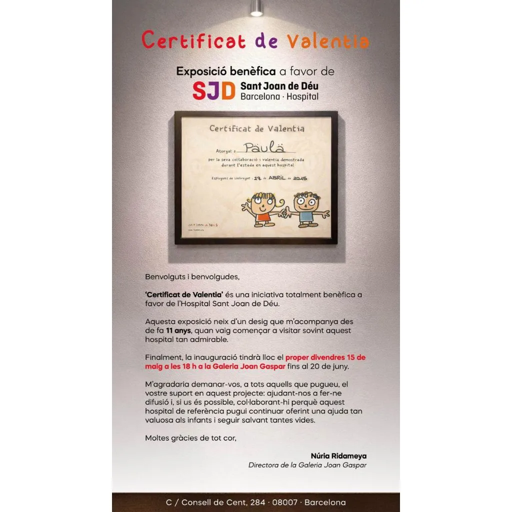 Hace más de una década que la Galeria Joan Gaspar de Barcelona, centro de arte con mucha historia, piensa en hacer una exposición benéfica a favor del Hospital Sant Joan de Déu Barcelona. Este año, por fin, el sueño se cumple en la exhibición 'Certificat de Valentia'. Desde el 15 de mayo hasta el 20 de junio, la galería se llenará de obras cuya venta se destinará a los programas de nuestro centro.